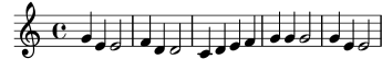 common-shortest-durationfrom a value of1/4to1/2. The quarter note is the most common and shortest duration in this example, so by making this duration longer, a ‘squeezing’ effect occurs:\score { \relative c'' { g4 e e2 | f4 d d2 | c4 d e f | g4 g g2 | g4 e e2 | } \layout { \context { \Score \override SpacingSpanner.common-shortest-duration = #(ly:make-moment 1/2) } } }The
